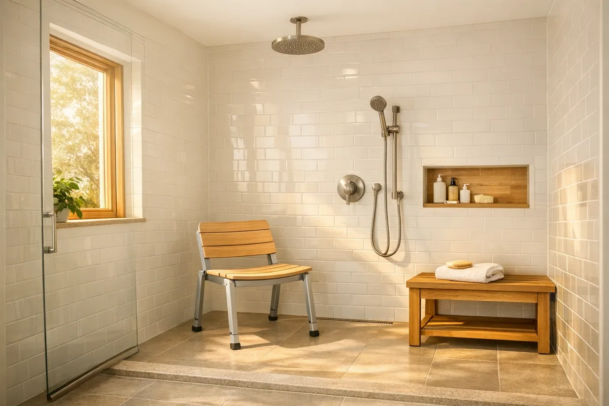 - A shower chair works best alongside grab bars and a handheld shower head. No single product solves wet-surface safety alone.